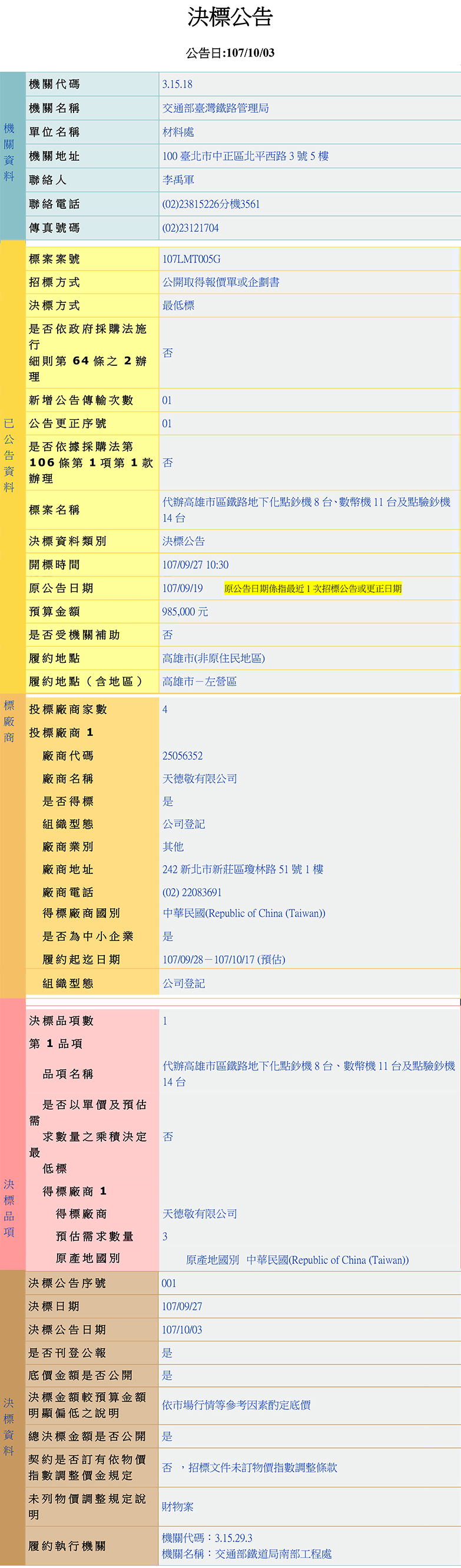 賀!!!!! 經銷商天德敬有限公司取得2018交通部台灣鐵路案